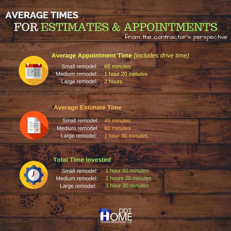 I’ve included a chart to help understand why it is important to schedule your appointment during the slower, holiday season. As you can see, for a company that receives 2 medium and 3 large remodel appointments, the average estimator would spend 13.5 hours completing those estimates. What this chart does not show the various projects that the Project Manager would be managing at the same time. So my sage advice is to ask for a remodel estimate during the non-peak times like during the holiday season.