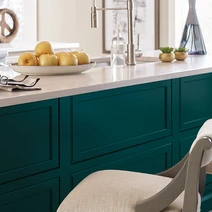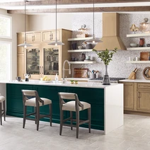 BOLD COLOR POPS: Mixing traditional finishes with bold pops of color create interest in a transitional kitchen. Islands continue to be the go-to piece for adding a snap of color. Shades of blue continue to top the trending choices for bold colors, but don’t let that stop you from adding your own personality to your kitchen design! Many cabinet brands offer custom options to get just the right color for your kitchen!