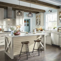MODERN FARMHOUSE KITCHEN: Elegance made comfortable and transitional to complement the style of your home. Soft creams and greys, warm finishes and subtle accents keep this look fresh. A custom island really completes the look!